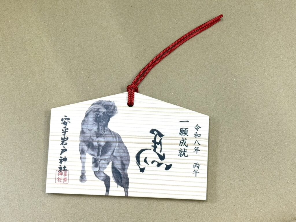 こちらの絵馬は、芸人のメッセンジャー黒田さんが書かれた「馬」の文字と、奥様が描かれた躍動感あふれる「馬の絵」をデータ化し、弊社で製作させていただいたものです。