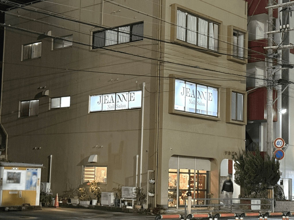 洲本市のイオン前にあるネイルサロン様の看板として、窓ガラス面の施工を行いました。磨りガラス調のシートをベースに貼り、その上から店名をカッティングシートで表現しています。